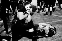 Marine played awesome! Up until the end of the second quarter when he blocked a guy three times his size and pulled his hamstring. The second half of the game he ran a few plays but mainly stayed on the sidelines. I hated that he got hurt but was relieved it wasn't worse then was.